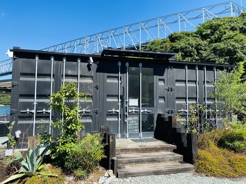 写真手前の黒いコンテナがゲストハウス。奥が宇城市と天草を結ぶ「天門橋」です。名前の通り本当に橋の下にある〜!といい歳してテンション上がっちゃいました(笑)
